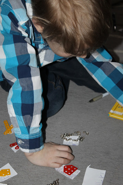 U nas w domu, to pierwszy zestaw tego typu klocków, więc zabawa zaczęła się już od przeglądania i posegregowania elementów. Syn podszedł do segregacji bardzo profesjonalnie opatrując poszczególne elementy przygotowanymi samodzielnie etykietami.